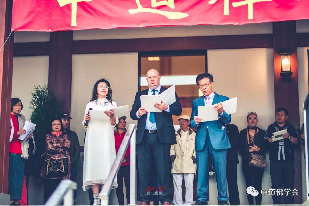 上午9點,在樸素、莊嚴的大殿前,在國語、粵語、英語三位司儀的介紹下,兩位維那師引領五位護法居士,托盤、持香,跪拜迎請中道禪林上如下源法師、上如下立法師,及來自臺灣、大陸的諸山大德先為大殿進行剪彩,這標誌著中道禪林大殿正式落成,現場響起熱烈的掌聲。